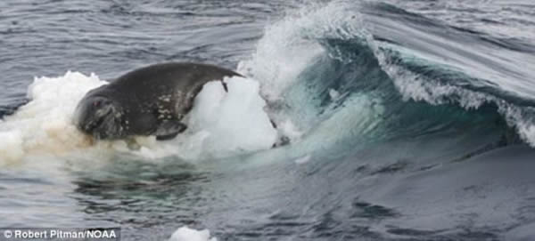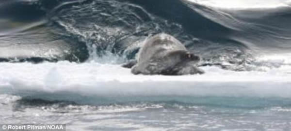 虎鲸制造出一道水墙,冲击浮冰,最后将海豹弄下水
