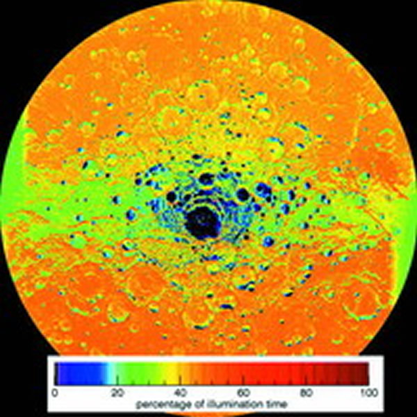 在日前于法国南斯市举行的欧洲行星科学会议与美国天文学会行星科学部的一次联席会议上,天文学家公布了这一标上色标的水星南极地区的新的航拍相片镶嵌图,其中的黑色斑点便代表了这些“冰冻”的区域。