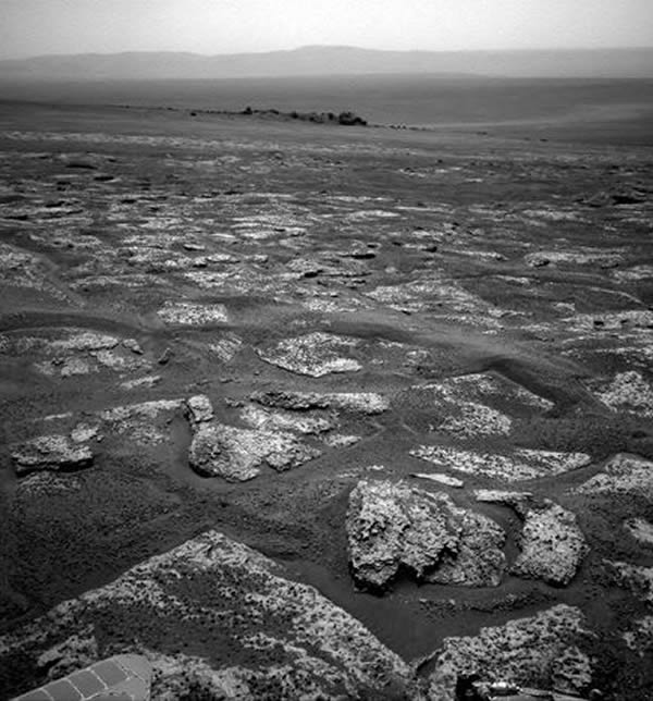 这是美国宇航局的机遇号火星车在抵达奋进陨石坑之后的回眸一望,这饱经沧桑之感顿时让人想起古代的罗马大道。这是美国宇航局近期公布的309张照片和一段录像中的一张图像,这批资料完整记录了机遇号从维多利亚陨石坑向奋进号陨石坑前进的道路上发生的一切。