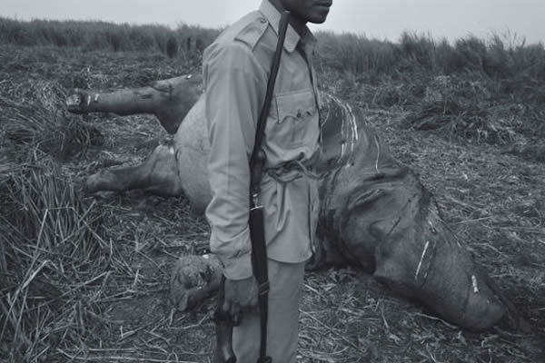在印度卡齐兰加国家公园内,一名护林员正在检查一头被盗猎者猎杀的犀牛的尸体。卡齐兰加国家公园位于印度东北部阿萨姆邦和雅鲁藏布江南岸,那里草木茂盛、丛林密布,湿地无边无际,拥有惊人的生物多样性,其中包括濒危物种独角犀牛和孟加拉虎。