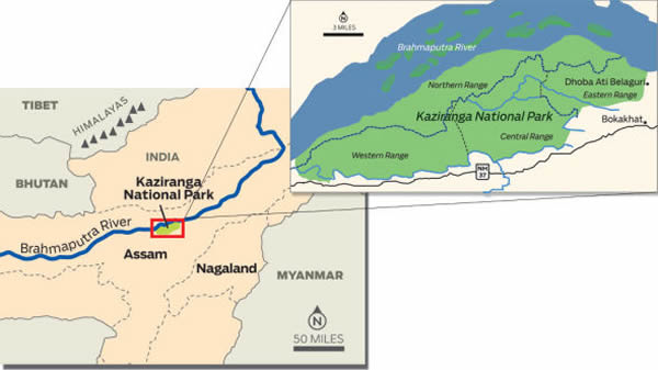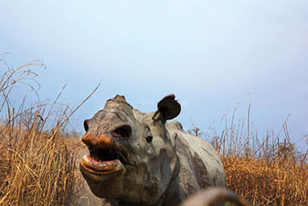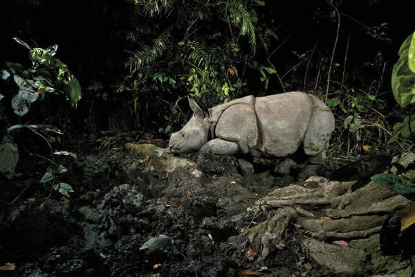 卡齐兰加国家公园内的相机陷阱拍摄到的濒危物种独角犀牛。卡齐兰加国家公园是草的海洋,草高约10英尺(约合3米)。大象像船一样在草地上滑行,而老虎则躲在草丛之中。全球亚洲独角犀牛现存数约为3000头,其中2000多头生活于卡齐兰加国家公园。20世纪初,阿萨姆邦的英国政府首次意识到独角犀牛可能会因为盗猎行为而灭绝,,因此将卡齐兰加地区设为保护区,当时那里的独角犀牛只有数十头。独角犀牛每两年才产下一个后代,繁殖较慢,群体数量增长也较慢。但自此以后,该地区的独角犀牛总体数量呈缓慢上升趋势。到1974年卡齐兰加成为国家公园时,那里的独角犀牛数量已达数百头。