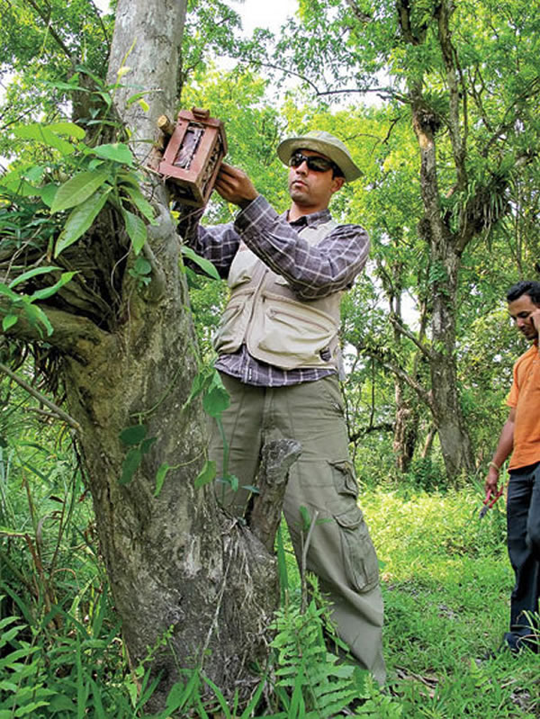 野生动物学家费罗兹-艾哈迈德在卡齐兰加国家公园内安装相机陷阱用于拍摄和研究当地野生动物。