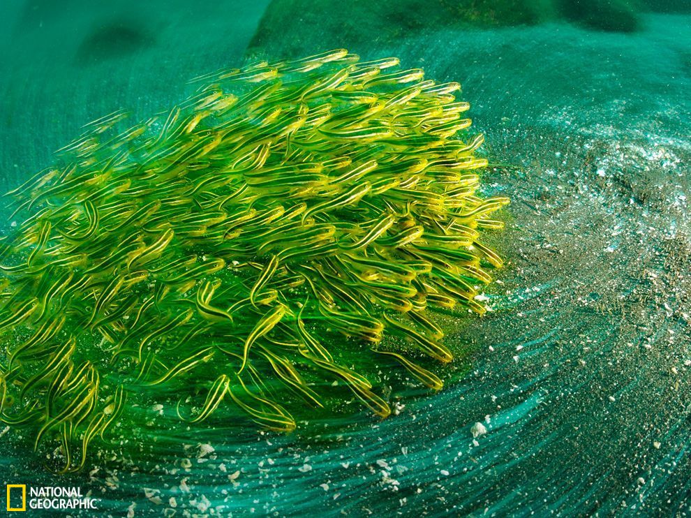 日本伊豆半岛的骏河湾,一群幼小的海鲶鱼在多沙的水底游动。