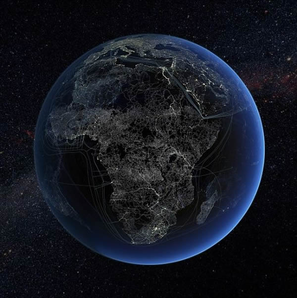 夜色下的非洲,展示了公路、铁路、数据传输线路以及连接大陆的海底数据电缆等人类技术