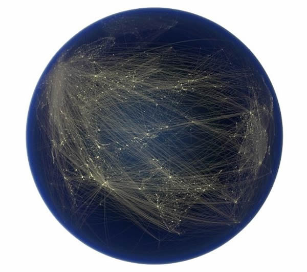 加拿大人类学家费里克斯-菲兰德利用13年时间绘制出一幅幅令人惊异的图像,展现数据同步传输电缆、飞机和公路等人类技术如何在地球表面“殖民”。图像中,大量金色线在暗淡的地球上延伸,形成一个生动的蜘蛛网,展现人类技术如何影响地球。