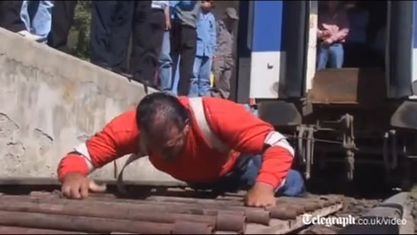 报道称,叙利亚大力士阿德南·伊斯梅尔·阿瓦德(Adnan Ismail al-Awad)准备挑战的是一节他自称有100吨的火车车厢,车厢内挤满了人。阿瓦德在肩膀上套上了装置,整个身子趴在铁轨上艰难地匍匐前进。