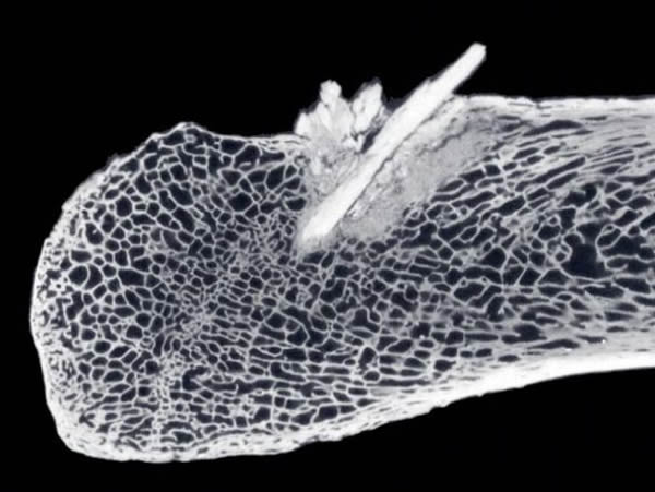 根据一项新研究,对乳齿象肋骨进行的分析发现,美洲原住民使用尖头骨制武器猎杀大型动物的时间要比此前预计提前近1000年。在这组图片中,A为乳齿象肋骨特写照片,D为完整肋骨照片,B为数字还原图,C为X光片。在A和D图,断裂的矛镞仍清晰可见。这件武器由骨头打造,1.38万年前的美洲猎人曾用它猎杀动物。