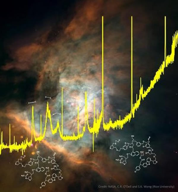 猎户座星云上发现复杂的有机化合物。这是红外空间天文台观测到的光谱