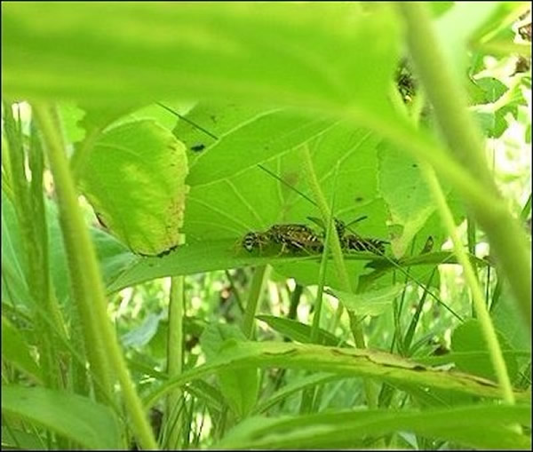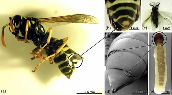 寄生虫(Xenos vesparum)幼虫跳到欧洲造纸胡蜂身上,藏于工蜂腹部,在那里它可以以宿主的血液为食