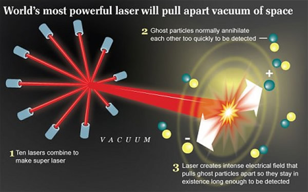 科学家介绍称,超强光线将由10束光线组成,每束光线的能量相当于普通激光的两倍,整个光线束的能量总和相当于全球世界发电量总和的10万多倍。如果将光线束的能量聚焦于一点上的话,该店所产生的能量甚至比太阳内部还要高。如此高能量的光线能够将宇宙真空状态“撕裂”,其内部的神秘粒子物质则会暴露在科学家的面前。这种粒子物质被研究人员称作是“鬼魂粒子”,它们几乎是在出现的同时便消失的无影无踪,但是如今科学家们相信利用超强光线可以清楚地侦测到“鬼魂粒子”。科学家还表示通过研究“鬼魂粒子”能够明白为何宇宙中存在太多人类未知的事务,此外暗物质究竟为何物、从何处而来等问题也将得到解答。