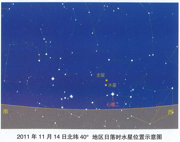 本次水星东大距期间,它的亮度约为-0.3筹,下方1等红巨星心宿二由于落下更早,很难被观测到。但金星就在水星上方2°左右,亮度约为-4等,以它为参考找到水星会比较简单。
