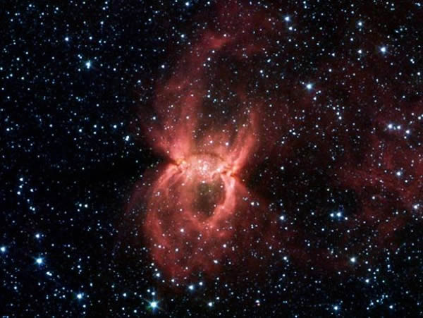 美国宇航局斯皮策太空望远镜拍摄的一幅红外照片,展现了黑寡妇星云。黑寡妇星云位于圆规座,由分子气体构成,外形好似一只可怕的蜘蛛。这个星云内存在大量大质量年轻恒星,位于中部的黄色区域。恒星产生的辐射将周围气体吹进两个方向相反的“气泡”,形成球茎状的“身体”和“蜘蛛腿”。为了庆祝2011年的万圣节,美国《国家地理杂志》的编辑挑选了一些诡异的天体进行盘点,黑寡妇星云便是其中之一。