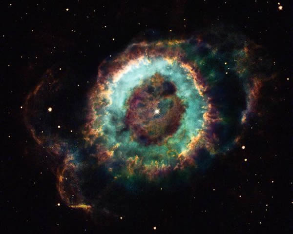 小幽灵星云NGC 6369是很多业余天文学家的最爱。从地球上观察,它是一个黯淡气体云,环绕一颗恒星尸体,座落于蛇夫星座。在这幅“哈勃”2004年拍摄的照片中,小幽灵星云展示了其更多细节,揭示了已死恒星放射出的气体的演化。恒星产生的紫外辐射剥离气体中的原子,让附近区域离子化,形成明亮的蓝绿环。外缘的红色区域离子化程度相对较低。
