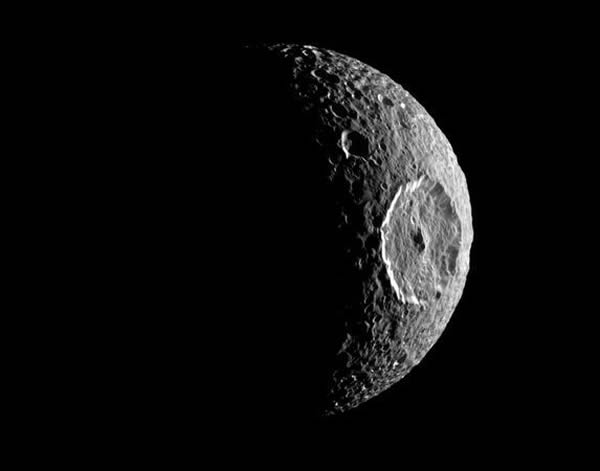 土卫一“米马斯”是土星众多卫星中的一个,表面坑坑洼洼。照片展示的大陨坑名为“赫歇尔”,直径大约在80英里(约合130公里)左右,相当于土卫一直径的三分之一。天文学家认为形成“赫歇尔”的撞击几乎撕裂了这颗直径250英里(约合400公里)的卫星。