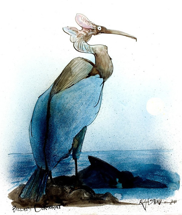 图3 雅典娜鸬鹚(Pallas’s Cormorant)。一般认为它们灭绝是在19世纪50年代。雅典娜鸬鹚曾生活在俄罗斯东海岸外的白令岛(Bering Island),多在陆地活动,飞行能力差,1826年在人类占领这个岛后,它们的命运就注定了。 (绘画 Ralph Steadman)