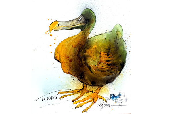 图2 渡渡鸟(Dodo)。印度洋毛里求斯岛上一种不会飞的鸟,在被人类发现后仅仅200年的时间里,便由于人类的捕杀和其他活动的影响彻底绝灭,堪称是除恐龙之外最著名的已灭绝动物之一。(绘画Ralph Steadman)