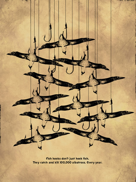 图6 信天翁。大量的信天翁误食人类的鱼钩后被丢弃而死,根据IUCN, 已有22种信天翁濒临灭绝。(绘画Peter Hodgson)