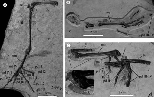 甘肃鸟的后肢骨骼和皮肤印痕(李岩供图)