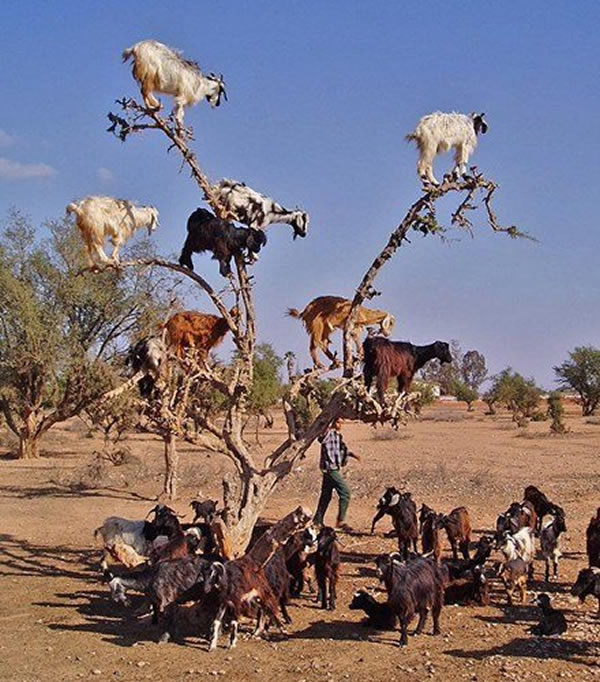 摩洛哥沙漠中的爬树高手——山羊 来源: 神秘的地球 时间:2011年11月04日 11:50 摩洛哥南部沙漠,山羊们为了寻找食物,渐渐学会了爬树 澳大利亚摄影师奥利弗近日在摩洛哥南部沙漠拍下难得一见的一幕:9只山羊居然一同爬上了一颗5米高的老树,其中一只甚至淡定地立在树顶。 摄影师解释道,沙漠地区炎热干燥且缺乏水源,山羊为了生存便慢慢学会了上树的本领,而目标即是树上那些美味的树叶和坚果。“大约有30只山羊围在这颗树旁边,在我看到它们时,有几只已经站在树上了。随着山羊的移动,树干上上下下地随之摇晃着。” 中国新闻网 上一篇 下一篇 TAG: 摩洛哥 山羊