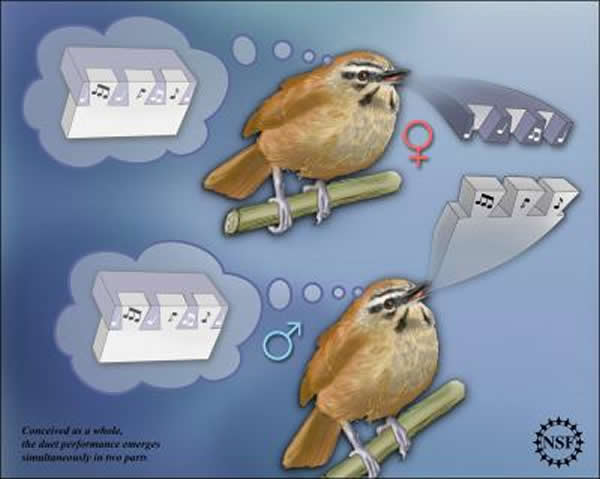 结婚良久的夫妇可以完成彼此的句子,但安第斯山脉的素尾鹪鹩所做的又更进了一步。 雄雌两性的鹪鹩哼着亲密的二重唱,并在哼唱时如此快速地更迭着音节,使得其听上去像是某单个的鸟在歌唱。 新的研究显示,雄雌两性鹪鹩的脑子实际上在处理整个的二重唱,而不只是每只鸟自己唱的部分。 这些发现令人惊讶,因为研究人员通常假设,每只鸣禽的脑部活动会大体上致力于该鸟自己的歌唱角色。