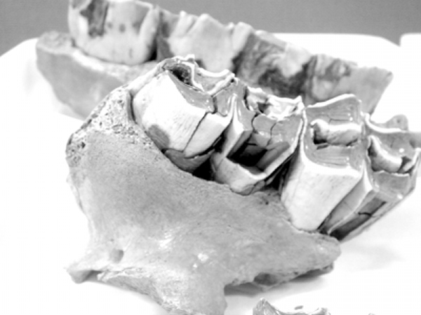乌兰木伦遗址出土的诺氏驼右上颌骨(前)和皮毛犀牙齿化石(后)。