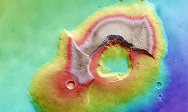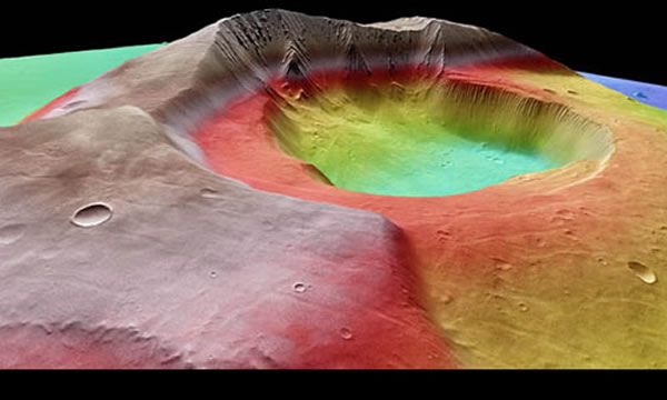 该图像是11月8日欧洲宇航局公布的火星巨大火山山峰,这是火星快车探测器高分辨率立体照相机拍摄的合成图像,不同海拔高度代表不同色彩。