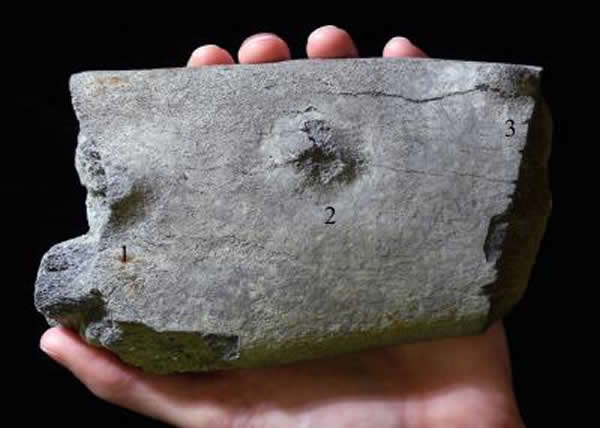 具鲨鱼齿痕的鲸鱼肋骨化石