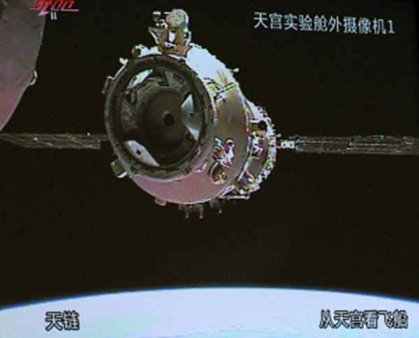 天宫一号舱外摄像机拍摄的刚刚分离的神舟八号(翻拍自北京飞控中心大屏幕)。
