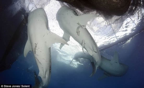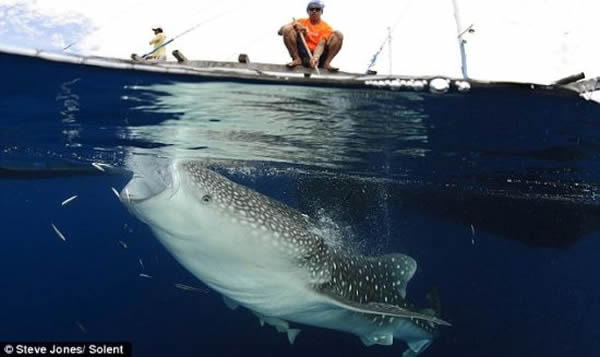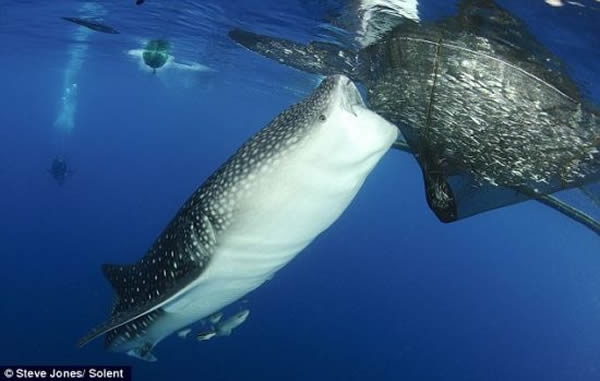在琼斯拍摄的照片中,体重达到20公吨的鲸鲨躲在渔船下面,而后游向渔网,张开大嘴偷食从渔网中跑掉的鱼。很多渔网出现破损,捕获的凤尾鱼虽然从网洞逃走,最后还是沦为鲸鲨的免费午餐。琼斯现年40岁,家住英国牛津郡瓦林福德。他说:“当地捕鱼台的渔网装满凤尾鱼,悬挂在水下,将一头头鲸鲨吸引过来。很多渔网出现破损,鲸鲨显然不会放过这个享受免费午餐的机会。它们利用好似大洞一样的大嘴将从网洞中逃走的鱼吸进去,饱餐一顿。”