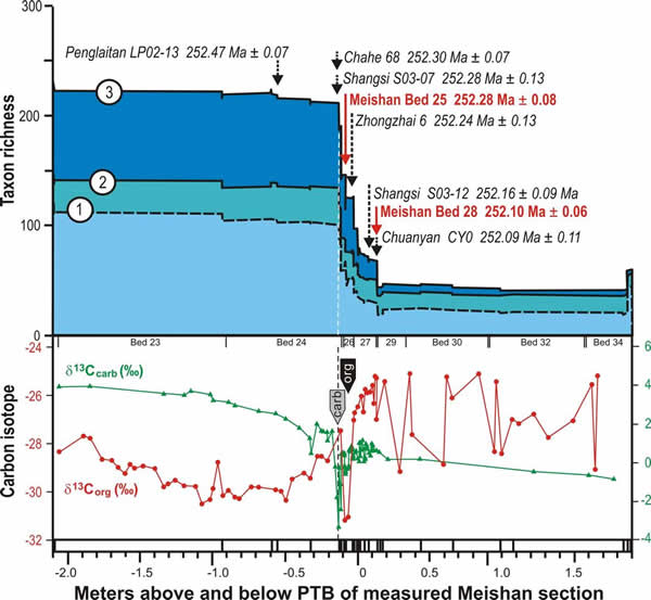 研究人员在对华南和西藏地区二十余条剖面开展高分辨率生物地层研究的基础上,对分布在华南地区海陆相地层中的29个火山灰层,进行了系统采集和高精度的地质年龄测定。建立了二叠纪-三叠纪之交1450种化石的翔实信息数据库,并运用计算机定量优化方法,克服研究程度差异和化石记录不完整性等所造成的偏差,首次建立了多剖面复合的突发式综合生物大灭绝模式,确定二叠纪末生物大灭绝发生在2.52亿年前,历经时间不超过20万年,其灭绝速度远远快于前人已有的研究报道。同时,论文通过对我国西南地区多条海陆过渡相和陆相剖面的生物地层、火山灰的精确年龄、植物群和煤层分布、碳同位素变化、沉积特征等研究,首次从生物地层、地质年龄和化学地层等多方面,建立了可信的海陆生态系统变化的对比关系。提出当时位于赤道地区的以大羽羊齿为代表的热带雨林植物群,在二叠纪末与海洋生物同时遭到快速毁灭性打击,为海、陆生态系统的同时崩溃提供了直接依据。