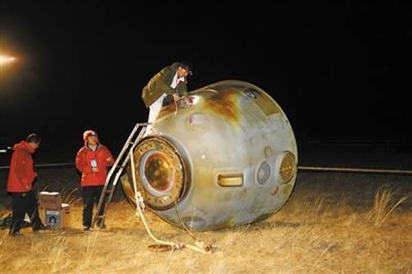 昨晚,神八飞船返回舱在内蒙古四子王旗着陆。这是现场工作人员打开飞船舱门。