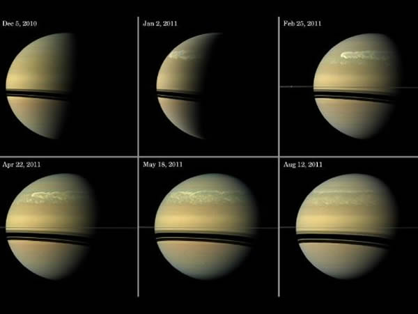 这是一系列卡西尼号探测器拍摄的图像,显示此次巨型风暴系统的发展过程