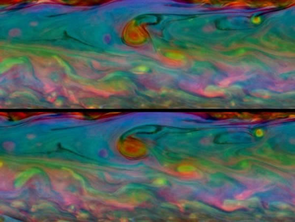 这两张假彩色图像显示的是在一个“土星日”内这个巨星风暴系统内部一些细小细节上出现的变化