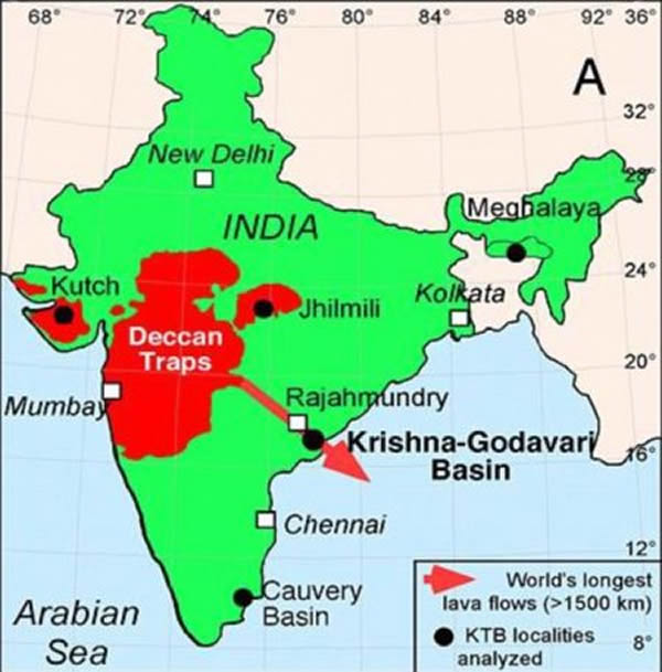 德干地盾的面积相当于法国的3倍,位于印度西部,是一个原始火山链。大规模火山喷发导致大气层中充斥着大量可以改变气候的二氧化碳和二氧化硫