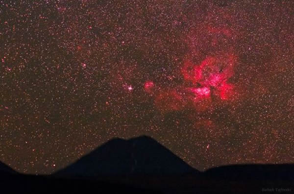 智利上空,船底座星云呈现美丽的粉红色。船底座大星云距离地球约7500光年。其红色和紫色色调源自这里大量的氢气气体与年轻的大质量恒星紫外辐射之间的相互作用。这里还有人类已知最大的恒星之一:船底座η,其质量大约相当于太阳的100倍。