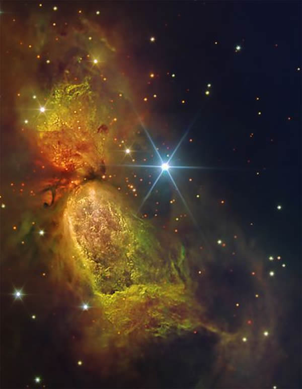 这是一张本月16日发布的图像,由欧洲设在智利的APEX望远镜拍摄,显示船底座大星云中低温气体和尘埃云的分布。APEX望远镜的工作波段一般是人眼无法看见的亚毫米波段。这张图像中的亚毫米波段数据以橘色表示,而其余部分的可见光图像则使用智利希洛·托洛洛山设立的泛美天文台柯蒂斯·施密特望远镜拍摄获取。