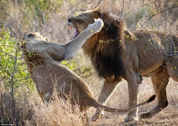 公狮与母狮发生争斗,由凯耶在南非旅行期间拍摄。凯耶递交皇家摄影学会的所有作品均在南非拍摄