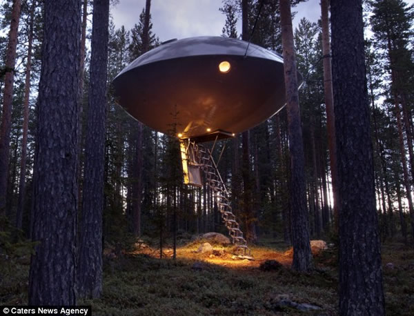 “太空酒店”的外形酷似一架在林中徐徐降落的UFO。