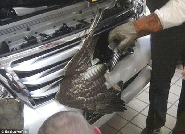 美国一只老鹰撞上以时速96公里飞奔中的汽车,并卡在前部进气栅处