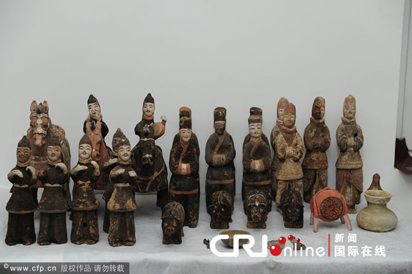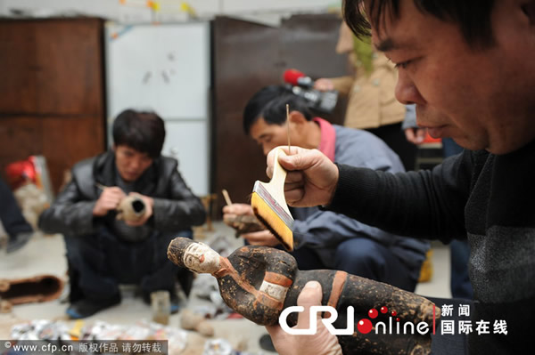 2011年11月28日,西安,清理的部分彩色陶俑。