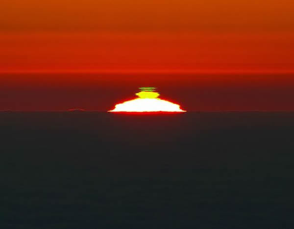 照片在智利阿塔卡马沙漠海拔高度8530英尺(约合2600米)的帕拉纳山上拍摄,展示了落日上方出现的两个明显的绿光弧。这种绿光是一种光学现象,在阳光被地球大气层弯曲,分割成不同的颜色所致。在太阳靠近地平线以及阳光穿过最为密集的大气层时,这种现象被放大。在一切条件都适合情况下,绿光等波长较短的光线弯曲程度超过橙光等波长较长的光线,进而在日盘顶部附近出现绿光。