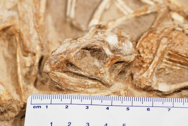 安氏原角龙幼仔头部化石特写,微小的喙形嘴清晰可见。在这一地区发现的其他化石显示,一只成年安氏原角龙和一只迅猛龙也命丧同样的“死亡陷阱”。法斯特维斯基说:“这是两个令人吃惊的例子,向我们展示了大约7500万年前的恐龙行为。迅猛龙可能捕食安氏原角龙幼仔。沙漠地区环境恶劣,可能导致恐龙拥有较高的死亡率。”