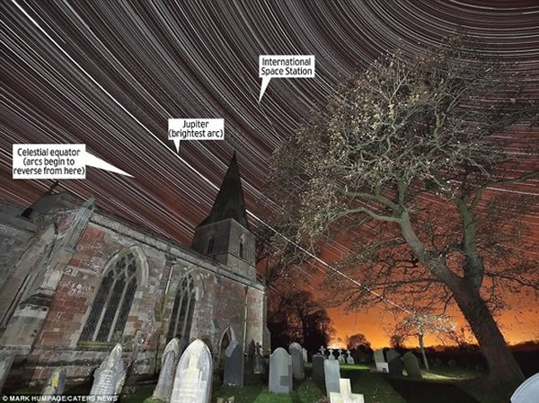 从这张图片看去,有些像行星移动的尾迹,但实际上这是国际空间站,天球北极,天球赤道以及木星在英国夜空“越过”的痕迹。