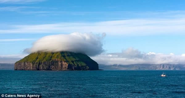 法罗群岛的偏远岛屿拉姆特拉-德姆岛,顶部被一个形状奇特的云朵罩住,好似一个巨型纸托蛋糕