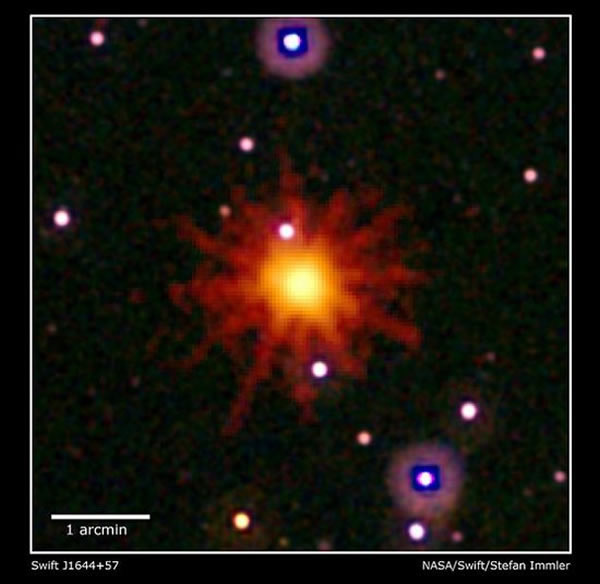 美国宾夕法尼亚州立大学和哈佛-史密森天体物理中心组成的天文小组在今年3月通过雨燕(Swift)卫星在宁静的天空中发现了几个X射线爆发。经过分析发现,这些X射线爆发是距地球39亿光年远处一个超大质量黑洞撕裂并吞噬靠近它的一颗恒星,然后发生令人惊叹的喷射现象,被称为“相对论性喷流(relativistic jets)”,喷射物质可以达到几十万光年的长度。通过对明亮的紫外线化学分析显示,它来自被黑洞吞噬的恒星的残片,该黑洞质量约有一百万个大阳大。该天文小组的结论是:“雨燕”卫星正好位于恒星喷流物质飞出的路径上,所以观测到了这一天文奇观。