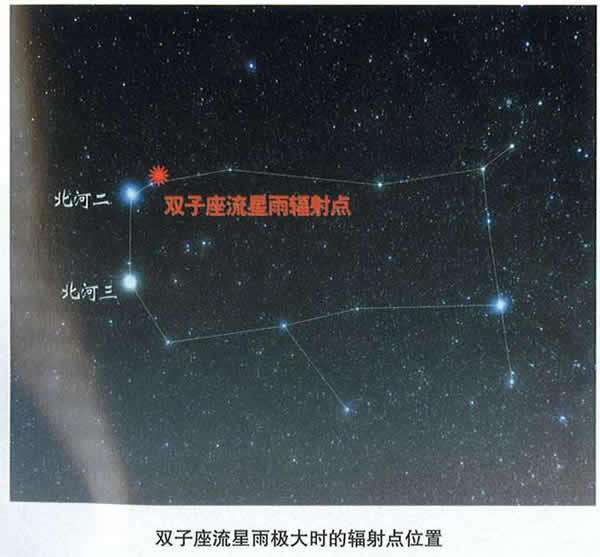 双子座流星雨每年的活跃期是从12月4日至17日,根据国际流星组织的预报,今年它的极大有可能出现在北京时间14日9时至15日凌晨。双子座流星雨的辐射点位于双子座α星北河二附近,几乎在日落后不久就会升起,因此整夜我们都能观测到其群内流星。但极大期间农历甘十的盈凸月会在大部分时间对观测产生影响,月光会使一些较暗的流星不容易被肉眼察觉到,这是今年双子座流星雨观测不可回避的问题。尽管如此,双子座流星雨依然是全年最值得观测的流星雨,只是大家在欣赏年末流星雨盛宴时一定耍注意防寒保暖。