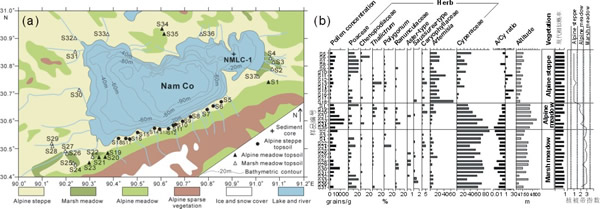 图1: 纳木错湖区表土、湖芯样品分布(a)和表土孢粉组合(b)