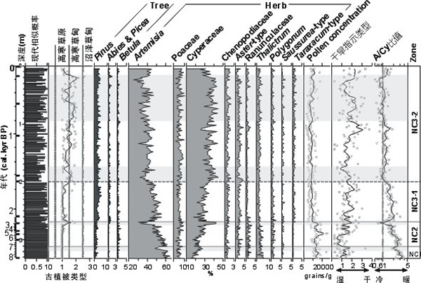 图2: 纳木错NMLC-1孔化石孢粉组合与古植被、古气候重建结果