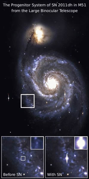 这项研究发表在近期出版的《天体物理学》杂志上,提供了美国俄亥俄州大学研究员通过亚利桑那州大型双筒望远镜勘测的星系观测数据。在首次勘测过程中,研究人员扫描了邻近25个星系中以不同寻常方式忽明忽暗的恒星,其目的是捕捉恒星死亡时刻。这项研究工作持续了3年时间,惠尔浦星系中的奇特无名双星系统被列为首个产生超新星爆炸的恒星系统。