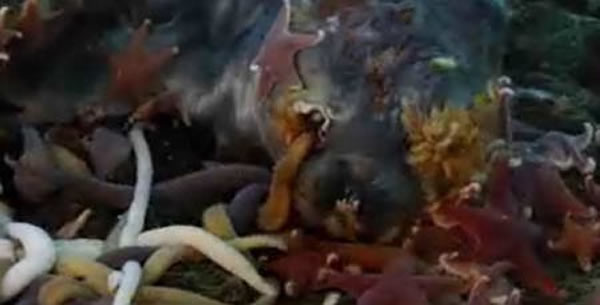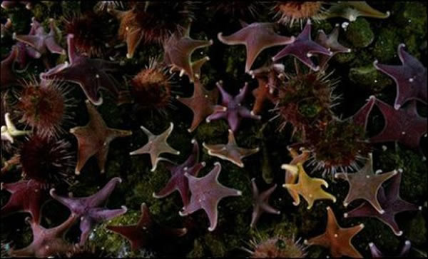 英国一支摄影队在南极厚厚的冰层下拍摄到大量五颜六色的海星和3米长的巨型虫。他们通过延时拍摄发现,大量深海生物临时聚在一起,疯狂地争吃一只沉入海底的死海豹。